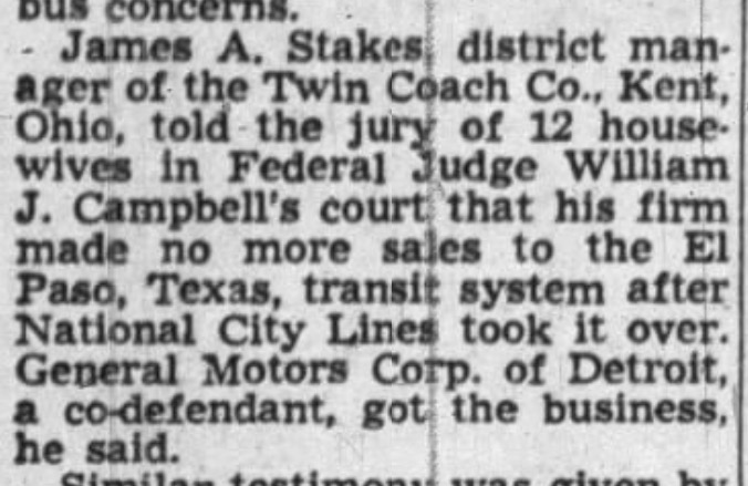 Count Two: Violating Section Two of the Sherman Antitrust Act. They were accused and found guilty (upheld in appellate court, U.S. v. National City Lines, 186 F.2d 562 [7th Cir. 1951]) of selling busses to themselves. Literally nothing to do with streetcars. When NCL was laying out new bus lines, they committed the “crime” of using their own busses. For example, who were some of the witnesses for the prosecution? Pacific Ford Motor Coach, and Twin Coach Company, who testified that they lost out on business when NCL (who, again, had a tying agreement with GM) bought GM busses. But Pacific Ford and Twin Coach said that just wasn’t fair. The government thus brought NCL up on charges, because being your own customer is illegal under antitrust law.