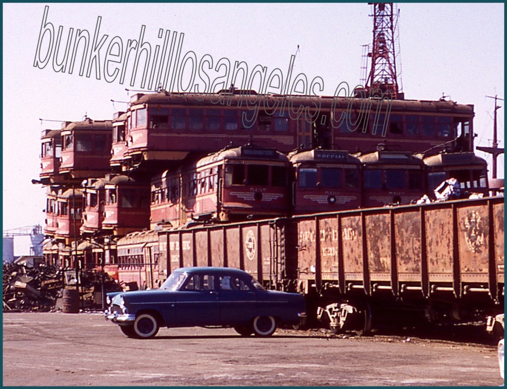 So LARy is bought by National City Lines. The Yellow Cars are largely converted to busses through the 1950s — (and before you say yeah! evil GM busses! they actually replaced most streetcars with ACF/Brill electric trolleybusses) until by 1958 only five (of the original 25) streetcar lines remained in operation — the J, P, R, S and V. These were sold to the Metropolitan Transit Authority (today LA Metro). Just as a public agency had destroyed the whole of Pacific Electric Red Cars, it was a public agency that destroyed the last of the LARy Yellow Cars. Between 1958 and 1963 it was your tax dollars (well, your grandparents’ tax dollars) that sent all those Yellow Cars to the National Metal and Steel Corporation junkyard at Terminal Island, where they were broken up for scrap.