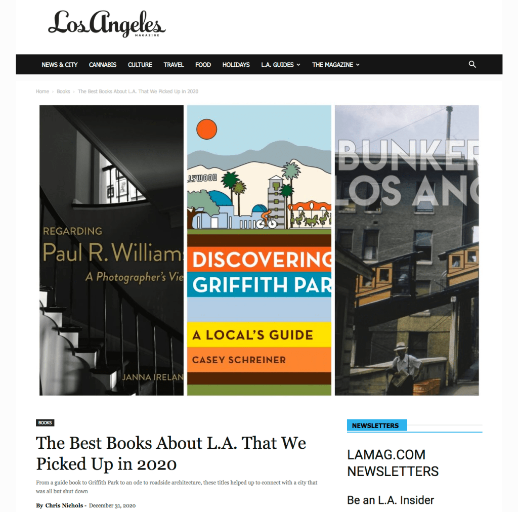While of course I post that here as a matter of simple pride, I would like you to click the link — https://www.lamag.com/culturefiles/best-books-2020-los-angeles/ — and go check out all the other titles (note that Hollywood Park and Paul Williams were also produced by those titans of Los Angeles publishing, Angel City Press!) and add some to your reading list, because that should be your 2021. But also with murder hornets.