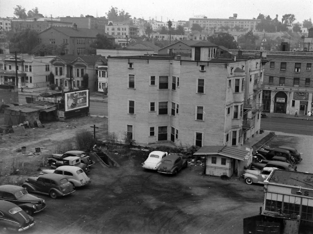 Above, the southwest corner of First and Olive (with the Mission-Revival Owens Apartments at 502 West First, in all its parapet’d and tile-towered glory), First Street running west up the right side of the image, shot from the towering dirt hill kittycorner.