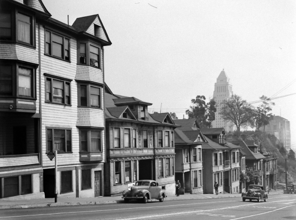 It’s fascinating to get a glimpse into what was considered ugly in 1945, and how that fit into greater cultural prejudices against old buildings (I go into this a bit on p. 64 of BHLA—e.g., the 1941 play/1944 movie Arsenic and Old Lace, in which we learn to stay away from the Victorian house on our block, as it is likely inhabited by psychopathic, poisoning spinsters). One wonders how Sanders, who lived till 1985, felt about his role as a documentarian come the early 1960s, when the Bunker Hill streets he walked in 1945 were depopulated and demolished.