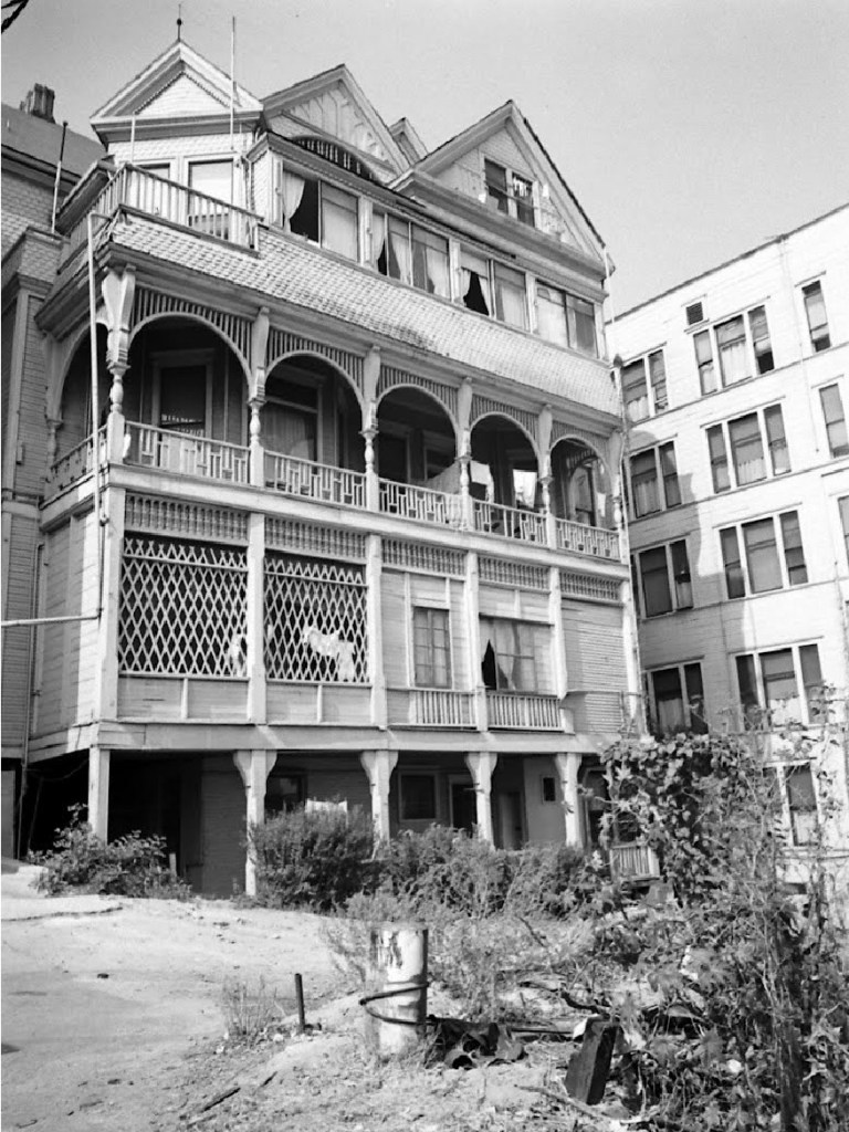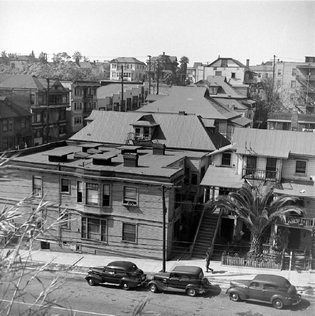 Basically, Sanders went to Los Angeles and San Francisco in November 1945 and shot those intricate and ornate (read: ugly) structures found in their urban cores, along with some opposing shots of the new, orderly suburban developments popping up as part of the beautiful postwar world. In San Francisco, Sanders shot mostly in Chinatown, and when in Los Angeles, on Bunker Hill; those being the two most photogenically timeworn neighborhoods whose structures exhibit the greatest superfluity of ornament—which to the mid-Century mindset was not just ugly, but positively gauche, and vulgar.