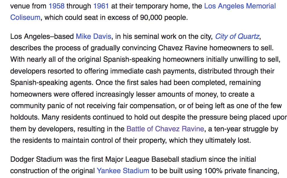 …remember, you are being lied to. You are being lied to by agenda-pushing lying liars. Maybe when some idiot added this nonsense to the Dodger Stadium Wiki page, they were merely…mistaken. But the next paragraph about “developers” trying to “create a community panic” is such absolute fantasy, it could only be the product of contemptible con artists. If you’re interested in this topic, I go on a little bit more about it here and here.
