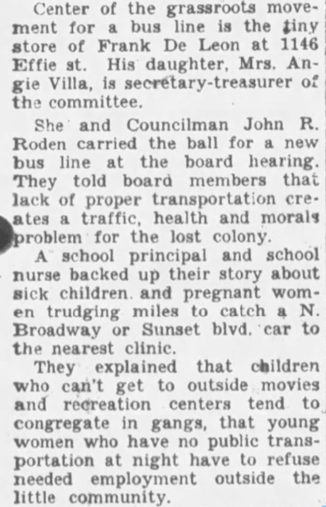 In 1946, the residents of Chavez Ravine banded together to get a bus line. Frank De Leon, who had a market at 1146 Effie, used it as HQ for the central committee to make this happen.