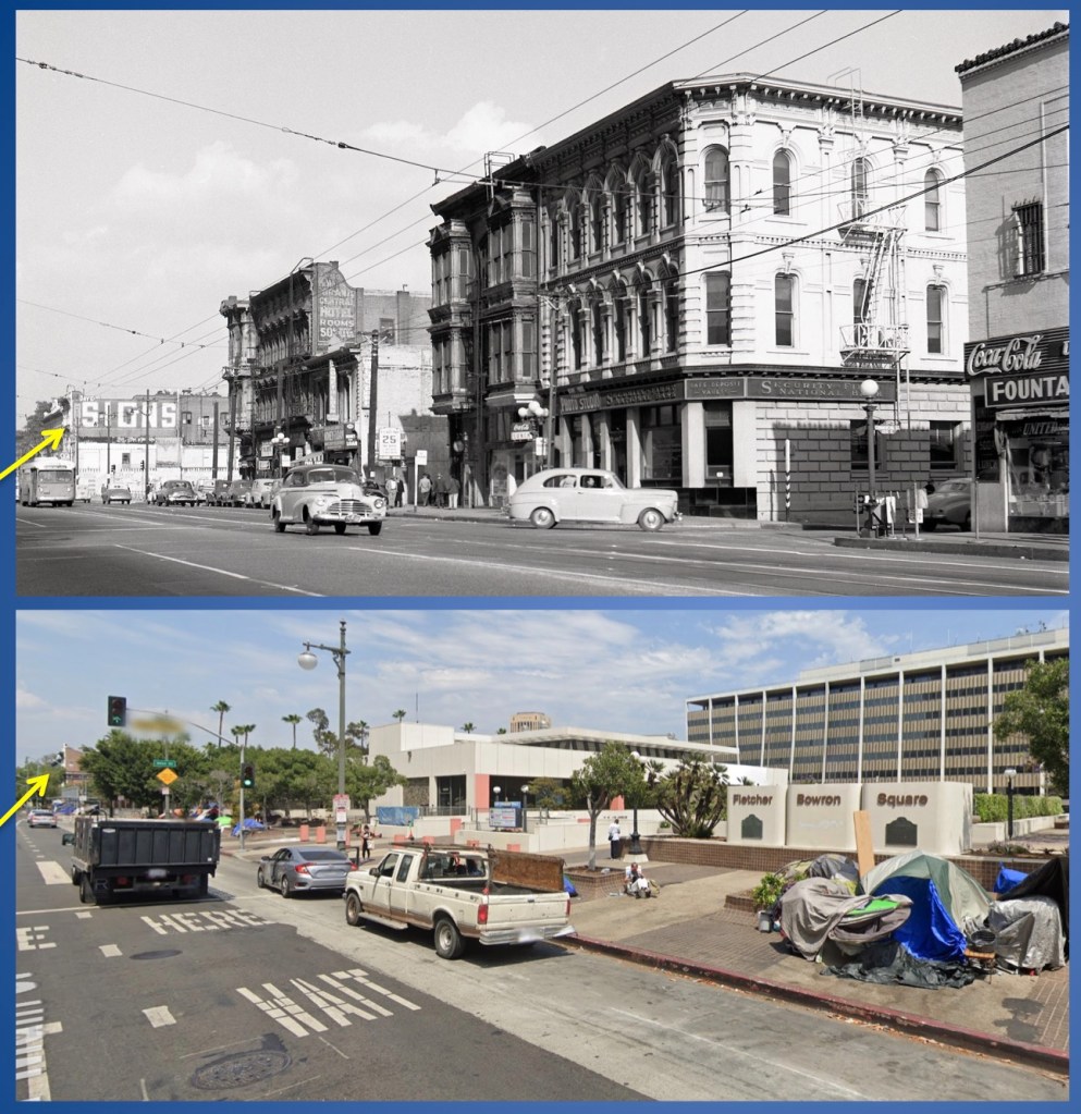 At far right, the eight-story Merchants Bank and Trust (Dennis & Farwell, 1905) with the “Water & Power” neon still stands today, though it was reclad with a modern façade in 1968, designed by William Hirsch Architects + Associates. At left, note the towering Million Dollar Theater down Broadway. Between the two, we’ve lost the Romanesque-facaded Potomac Block (Curlett & Eisen, 1890), demolished for surface parking in 1953, and Bicknell Block (Morgan & Walls, 1892), demolished for surface parking in 1958. Both the Boston Dry Goods building (Eisen & Hunt, 1895), and the Newmark Block, (Abram Edelman, 1898) — the two structures seen at left in this image — are still with us, sort of, having been cut down to one story and fitted with new fronts.