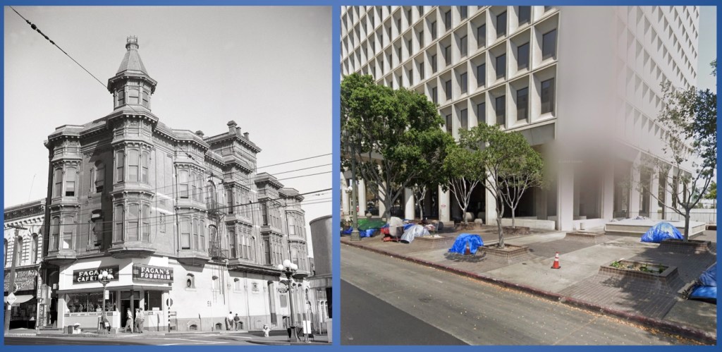 The torn awning indicates Jerry’s Joynt (home of the world-famous Jade Lounge) — see views toward it by clicking here and here — now wiped away by a freeway entrance. Look closely and you can see how the south end of the Garnier Block was removed for freeway construction.