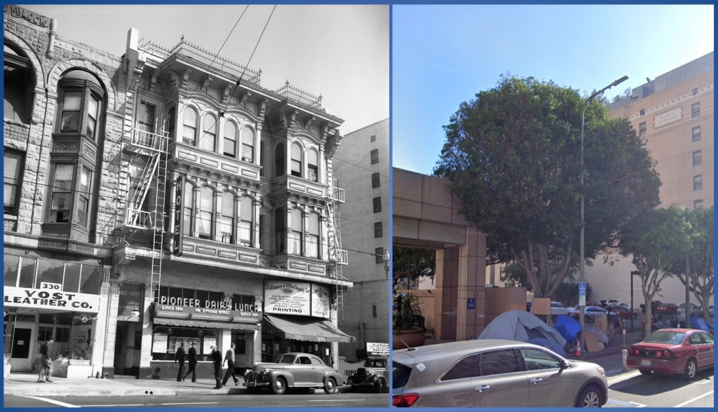 Center, the 1888 Cohen Block, 334 South Spring. At left, a bit of the Willard Block (Carroll Herkimer Brown, 1893). Both made into a parking lot, 1961. Note a corner of the Ronald Reagan State Office Building (Welton Becket + Associates, 1991) where the Willard Block once stood.