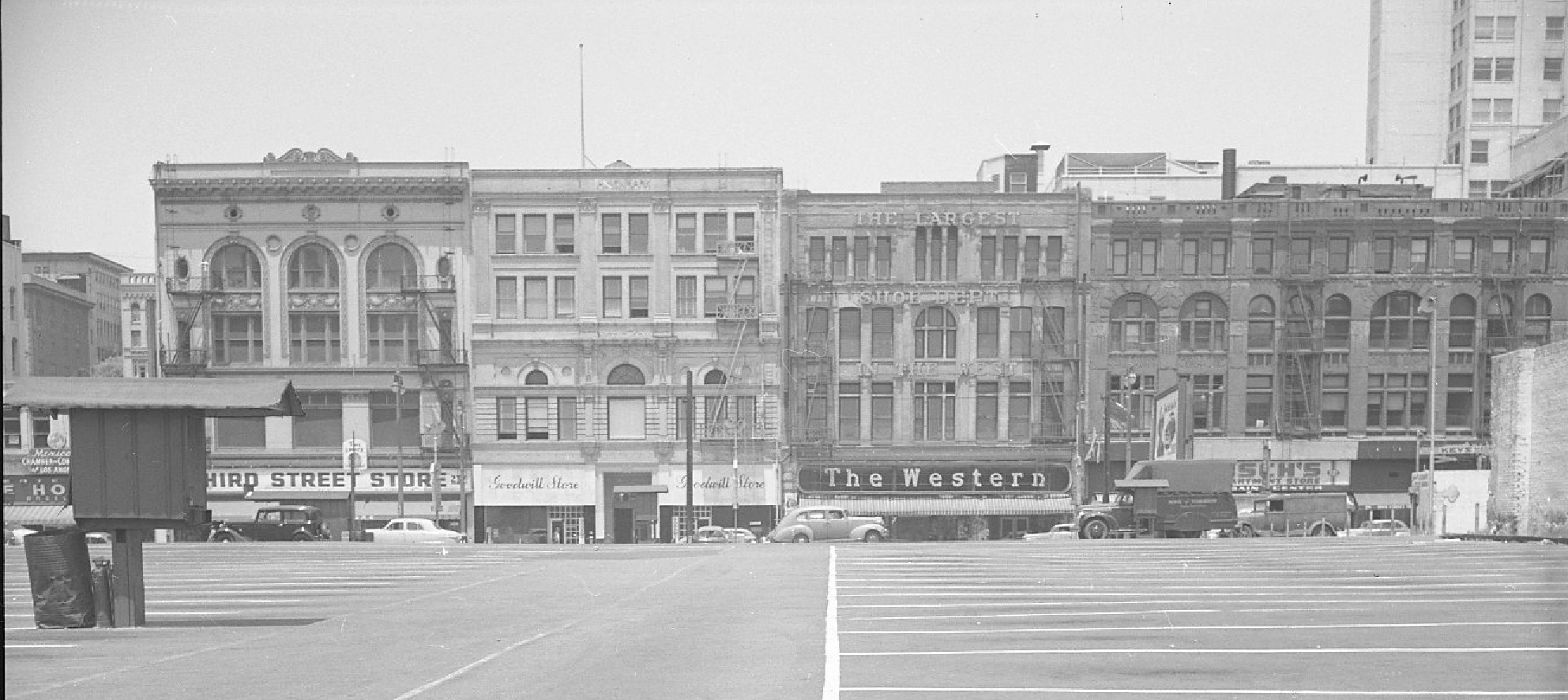 Looking at the northeast corner of Main and Market streets; the Amestoy Block (Adolph Charles Lutgens, 1888) was made a parking lot by the city in late 1958. Market Street was then wiped away in favor of Stanton and Stockwell’s City Hall East (1972).