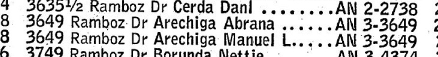 Sometimes people will say “no, they didn’t really own a house, it was owned by, like, a cousin or something,” but that’s bullshit. Manuel Arechiga, patriarch of the clan, had purchased a just-constructed house in 1956, 3649 Ramboz Drive in City Terrace. It cost $8,500, and by May 1959 the Arechigas had already paid off more than half their mortgage; that’s where they went in 1959, ergo, here they are there in the 1960 phonebook. Then also owned outright another house at 2410 Glover Place, where Abrana’s daughter Delphina lived. I won’t even go into the fact that Aurora owned two houses, John owned two houses, and Victoria owned three houses! Heck, even daughter Celia, whom you never hear about, owned her own house.
