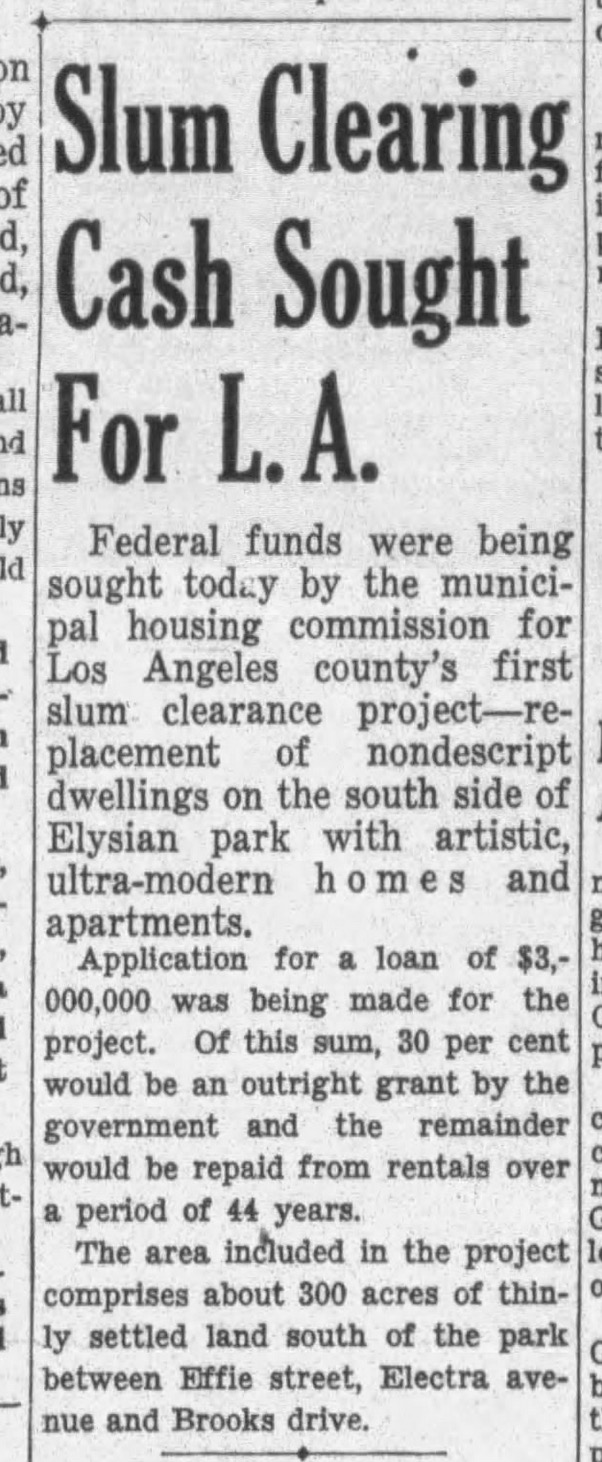Anyway, leaving aside the improbability of leftists, people of color, and Peoples World-reading Hebrews (by the way, wanna see some of the actual people who took the Chavez homes? wanna see the actual face(s) of L.A. Housing Authority’s “white settler colonial imperialism?” well here you go) feeling an overpowering need to screw the poor, it would have been impossible to do so by law. Los Angeles had previously removed large groups of people — dozens of times — for housing projects, and each time, there were federal, state, and city laws that had to be adhered to. The courts were involved every step of the way. When a property is taken from a person, they are paid “the highest price the land can bring if exposed for sale in the open market.”