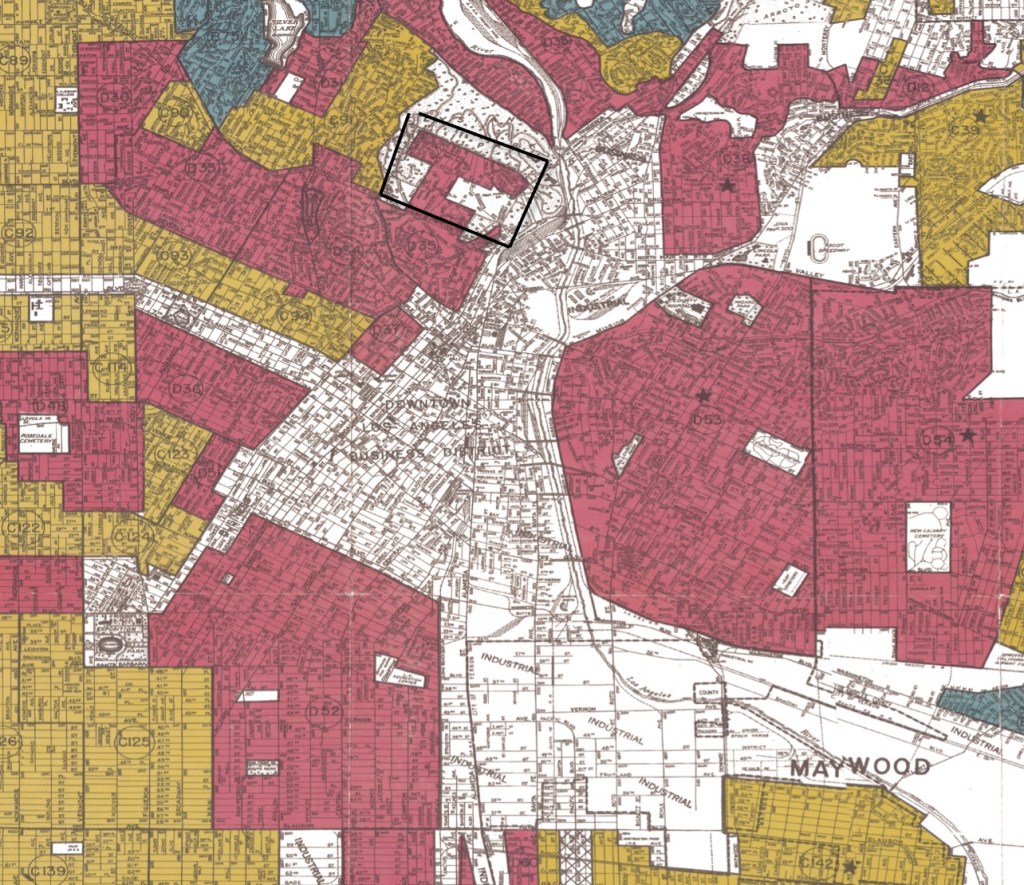 The area with the black square is Chavez Ravine. The white area represents mostly apartments, or commercial, so, not applicable. The red area is “risky” and yellow “declining” ergo, marked as risky for loan refinance. And while the notes in the government maps sometimes contained racist language (“subject area declining due to preponderance of foreign families” etc.) note that Bunker Hill, majority Caucasian, is redlined (in fact, the vast majority of US citizens “redlined” were white). Also, while redlining assessed lending risk and creditworthiness, evidence shows the HOLC did in fact loan heavily in red-shaded areas.