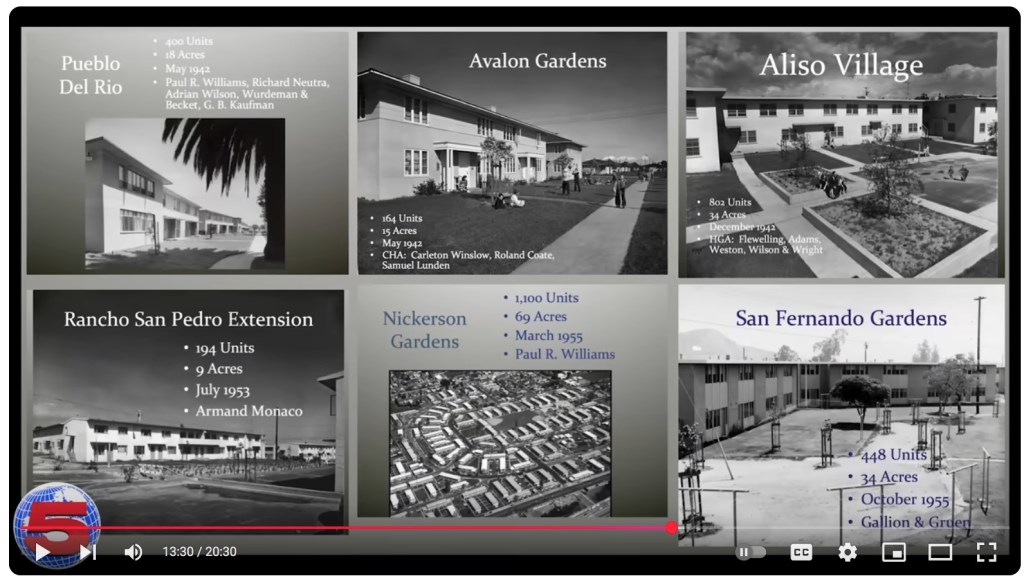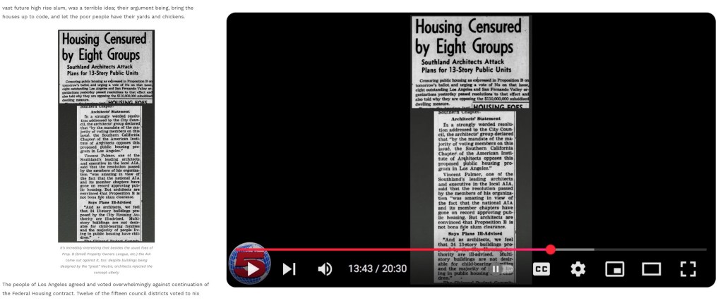 13:34 “somehow, someway, a real estate company hired a PR firm to run negative stories about the Elysian Park Heights building, calling it a ‘socialist communist experiment'” This is stupidly untrue. If it’s not, go ahead and name the real estate company, or name the PR firm. Better yet, just show me one of these “negative stories” — because the only time anyone in the 1950s called something a “socialist communist experiment,” it was New York Congressman Ralph Gwinn in 1954, referring to the TVA.