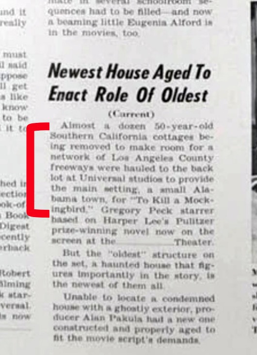 Let’s take a look at some Mockingbird presskits, issued for the December 1962 movie release, which state the houses were sourced via freeway construction: