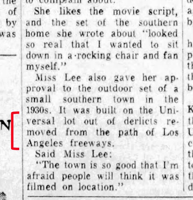 Sure, we have a couple internet randos claiming Chavez Ravine homes were moved to the Mockingbird set, but when that’s claimed, there’s never a citation, no actual primary source, no attribution, no evidence. That’s because it never happened. TKaM’s production designer Henry Bumstead did get some old L.A. houses, to be sure…houses that had been condemned, being in the path of freeway construction.