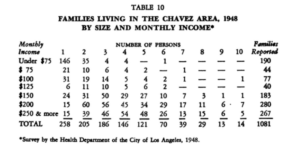 What’s at issue here is, what do they mean by “the Chavez Area?” This Health Department survey was 372 acres. However, the number of acres for the post-1950 Chavez Ravine redevelopment area was 315. The other 57 acres included Solano Canyon, which was densely populated (and still exists) and, as I understand it, the Alpine neighborhood (also extant). Therefore, the 1,081 number is very much inflated with neighborhoods and families that were never threatened by redevelopment.