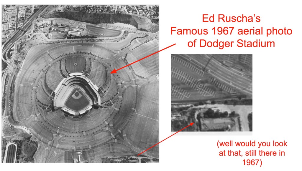 Only (apart from the obvious fact there’s no alternate universe where Building & Safety’s civil engineers would allow anyone to backfill into standing walls) the school wasn’t buried. It wasn’t buried because the Dodgers wanted to keep it. They used it, mostly for storage, all the way until about 1967, when it was demolished. Look: