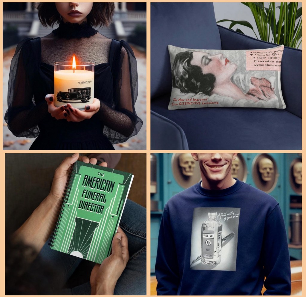 As long as we’re on the subject of spooky stuff, might I further suggest you purchase some ’tis-the-season sundries from Morguewear? They carry all the whatnot you need in life — shirts, pillows, coffee mugs, candles, notebooks — but conveniently emblazoned with vintage graphics advertising caskets, hearses, embalming fluid, and other fun stuff.
