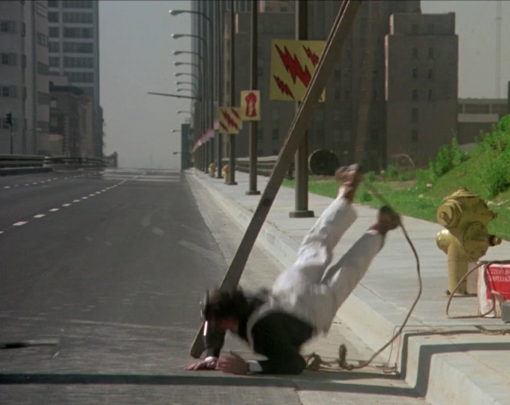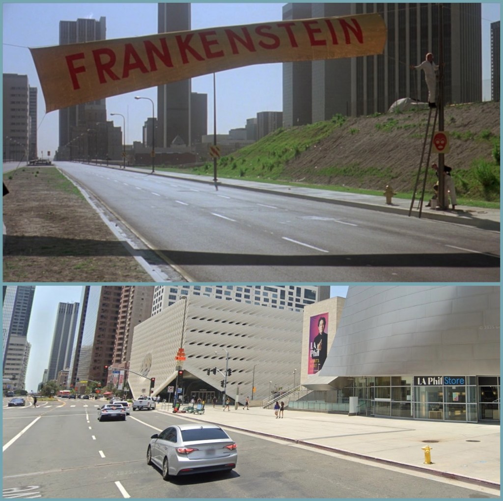 I was not disappointed. Death Race 2000 holds up as great unhinged trash cinema, and I was correct about brutalism-as-future in various DR2K scenes, e.g. the final act takes place at the Chet Holifield Federal Building in Laguna Niguel (as designed by Pereira, who designed Apes-era Irvine, so there you go). Plus there’s a bunch of other L.A. locations, like this scene shot at Pereira’s Union Oil just west of Bunker Hill.